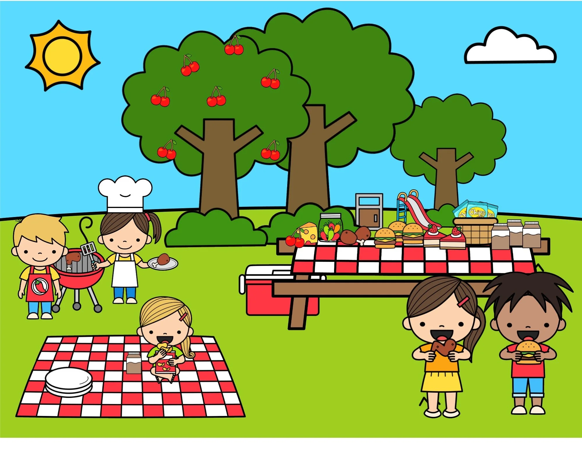 It was a cheerful day at Cherry Tree Park. The sun was shining, the birds were chirping, and the children were ready for a cheeseburger picnic.